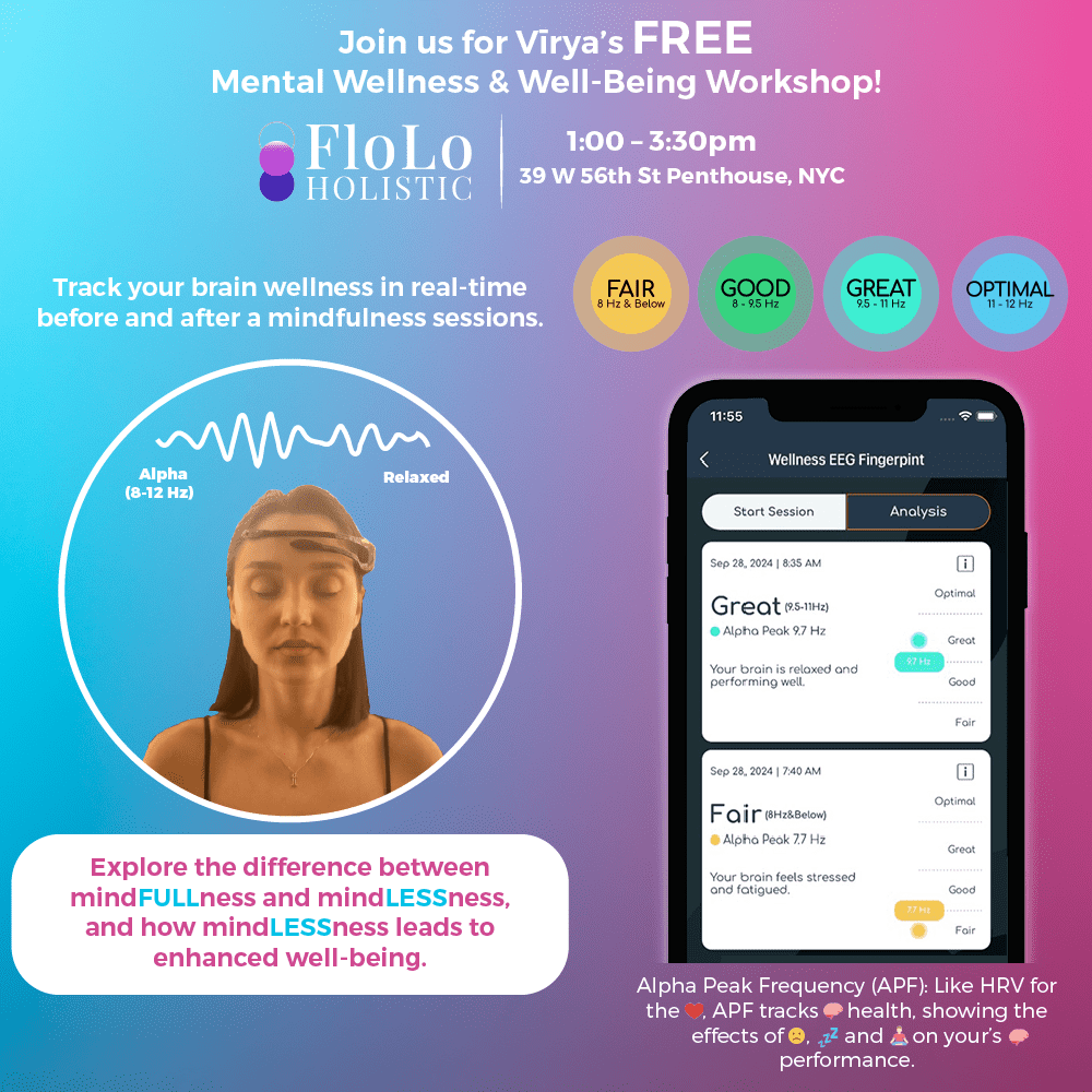 At Flolo Holistics in Midtown Manhattan – Two exciting events Virya is hosting to raise awareness and encourage sign-ups for our upcoming sessions, including a special retreat in October.